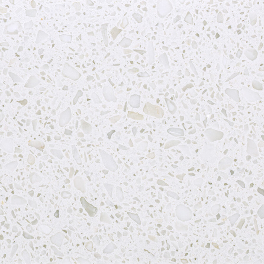 Een 'wit' composiet meubelblad - werkblad - bovenblad voor binnen, met een sfeervolle terrazzo look vervaardigd uit hoogwaardig marmercomposiet. Een mooie 'witachtige' kleurtint met wat grovere lichtgrijze korrelige tekeningen & accenten. Lees meer