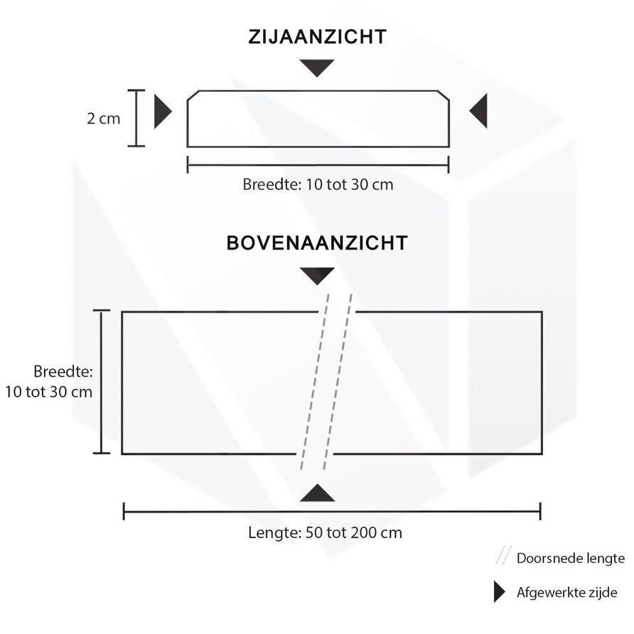 | Afmeting | Dikte: 2 cm - Breedte: 10 - 30 cm - Lengte: 50 - 200 cm |