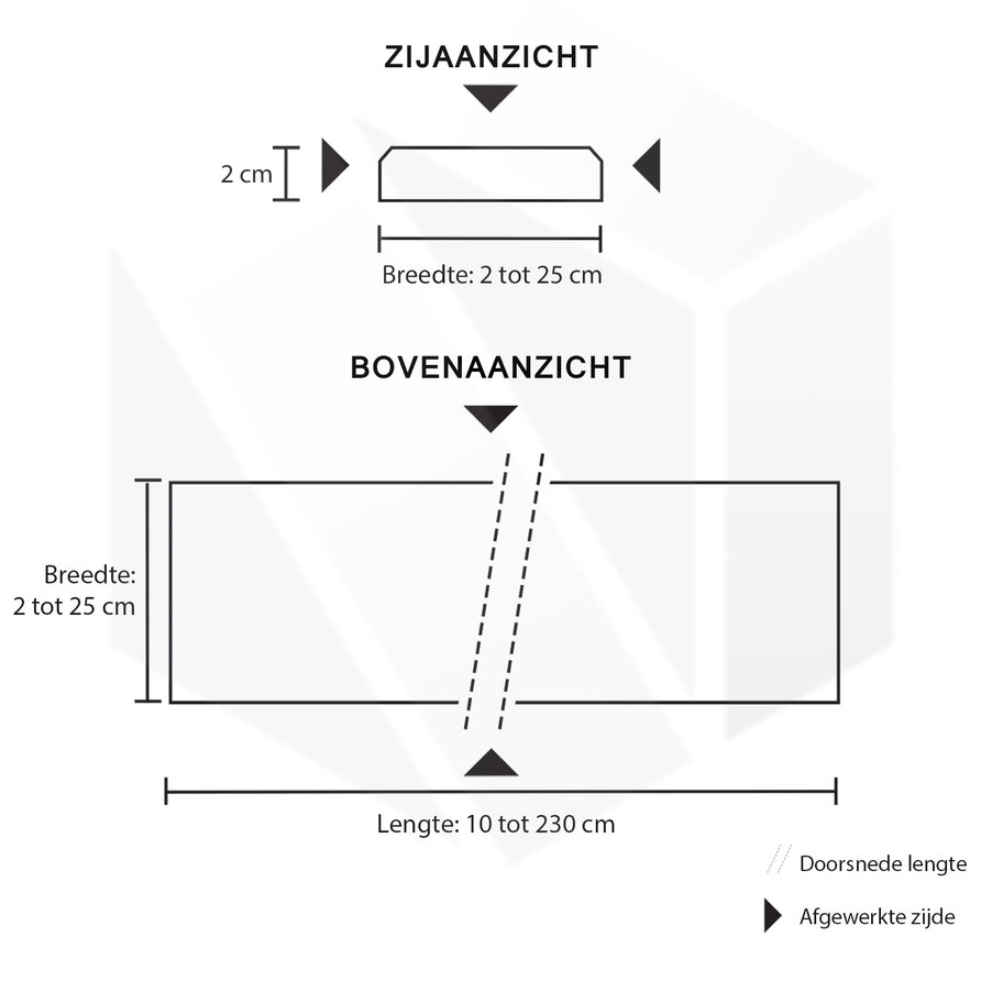 | Afmeting | Dikte: 2 cm - Breedte: 2 - 25 cm - Lengte: 10 - 200 cm |