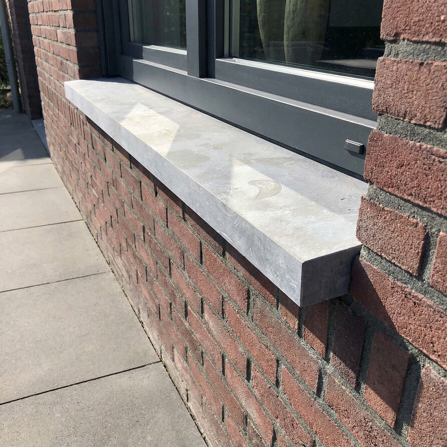 Deze blauwe steen buiten vensterbank wordt in eigen natuursteenzagerij - tot op de mm nauwkeurig - voor u op maat gezaagd & afgewerkt, door ervaren vakmannen, met zorg & liefde voor het vak. Standaard wordt uw buitenvensterbank 'recht gezaagd' en worden de voorkant + de helft van beide zijkanten (kopse kanten) afgewerkt, dat wilt zeggen geschuurd + afgewerkt met een facetrandje. Deze mooie topkwaliteit natuurstenen raamdorpel is - naast bijzonder praktisch - ook stijlvol & een luxe accent voor uw gevel(aanblik)!