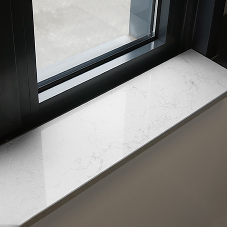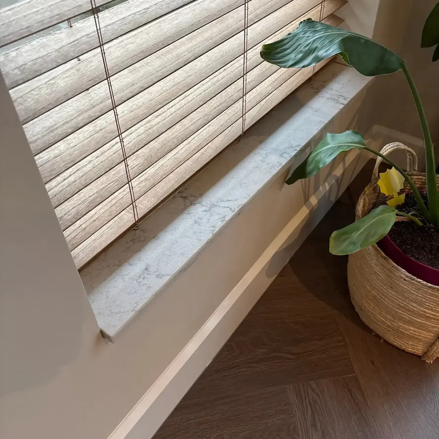 Een prachtige 'witte' bianco carrara marmer look / optiek vensterbank voor binnen, met een stijlvolle uitstraling, vervaardigd uit topkwaliteit kwartscomposiet. De witte marmerlook vensterbank heeft een heldere witte basiskleur met grijze tekeningen. Lees meer