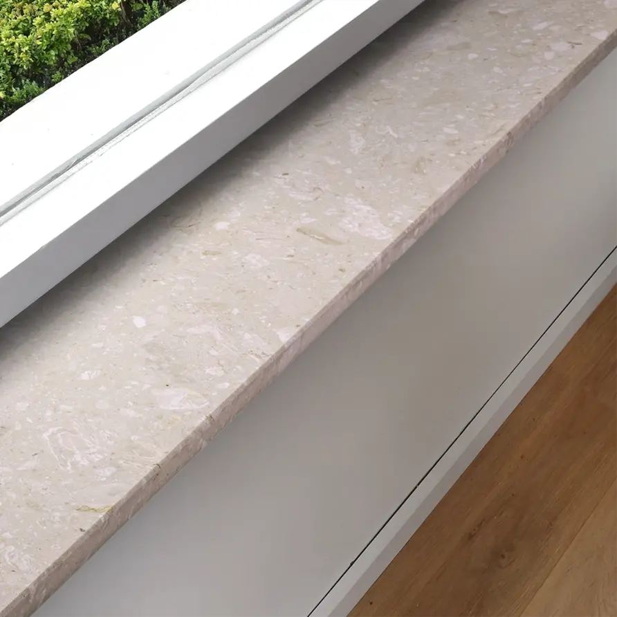 Een prachtige 'beige / zandtint' perlato look composiet vensterbank voor binnen, met een klassieke look vervaardigd uit hoogwaardig marmercomposiet. Een bijzondere kleur gebaseerd op Perlato; Die mooie Italiaanse marmersoort! Lees meer